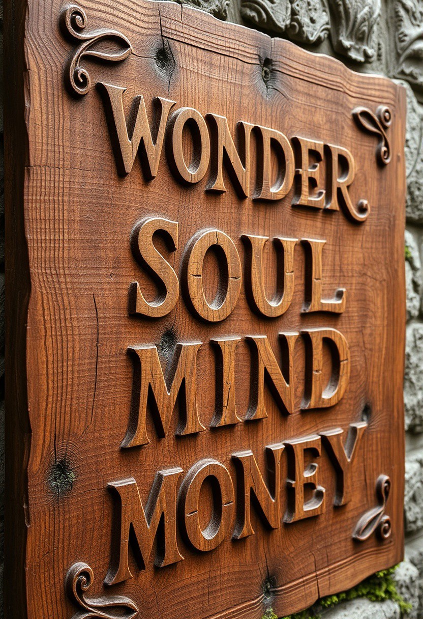 A large, rustic wooden sign with an ancient, weathered appearance, carved with intricate, ornate details, such as subtle engravings of swirling vines and mythical symbols along the edges. The wood texture is rich with deep grains, knots, and cracks, showing the effects of time and nature. Faint moss or lichen clings to the surface, adding to its old-world, mystical charm. The hand-written script is meticulously carved into the wood, flowing across four lines with the words: ‘WONDER,’ ‘SOUL,’ ‘MIND,’ and ‘MONEY.’ The wood appears slightly uneven, as though shaped by hand, with a natural, sublime beauty. Each letter seems to merge with the ancient carvings, as if it’s part of a centuries-old forgotten story.