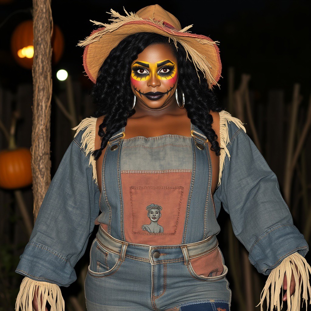 A honey brown skinned black woman dressed as a sexy scarecrow on Halloween night, huge hanging breasts, wide hips, thick thighs, a slim waist and a fat ass. She wears patchwork overalls made of various patterns and materials. She wears classic ((scarecrow face paint))