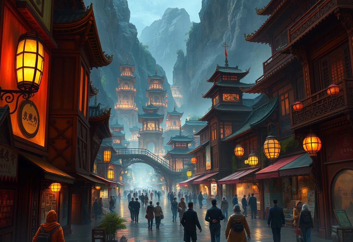 "view of the bustling main street, inside of the walled fantasy city of shangri-la, which is nestled at the heart of a fictional floating mountain range. The city is in equal parts wondrous and dangerous, where wild boas and pythons are only some of the hazards of daily life." (concept-art painting), evocative color palette,