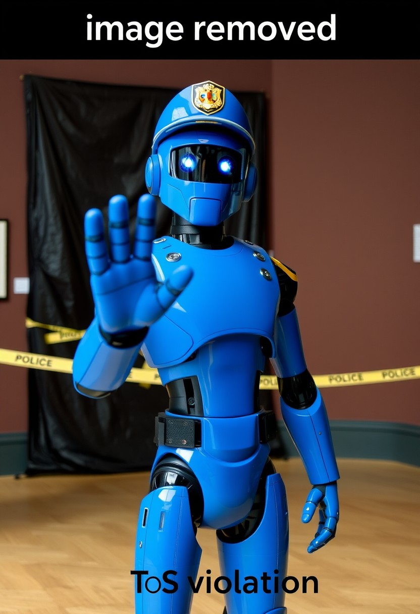 photograph of a blue police robot in winter parade uniform covering with a police hat. The peace keeping droid stands inside a museum. Looking at the viewer, it is extending its arm in a stop sign. Behind on the wall, we can see a painting covered with a black tarp and police tape. Title reads "image removed" at the top of the image. Subtitle reads "ToS violation" at the bottom.