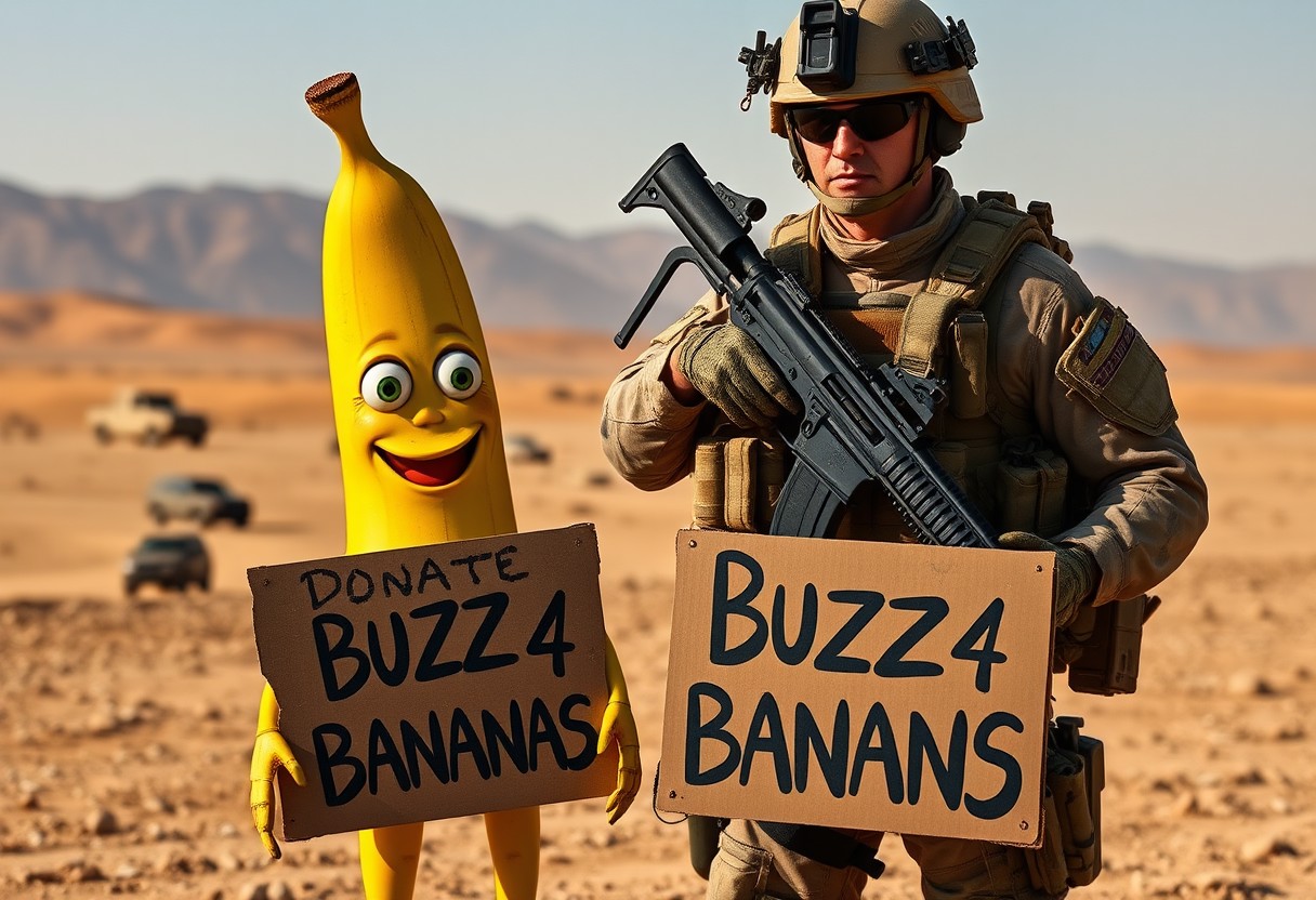 A highly detailed, full-figure real-life Marine Corps perfect soldier, standing still in a disciplined stance. The soldier is fully equipped with modern advanced weapons and tactical gear, showing intense focus and readiness. In front of the soldier is a 2-meter-tall anthropomorphic yellow banana with human-like limbs, expressive eyes, and a playful grin. Next to the banana, a cool, intricately designed cardboard sign reads, ‘Donate Buzz 4 Bananas,’ featuring complex typography and high-detail artwork. The background depicts a desert landscape in Iraq, with distant mountains, military vehicles, and the sun casting a harsh light over the rugged terrain, adding realism and depth to the scene. The contrast between the warzone setting and the absurd banana figure creates a surreal, yet detailed, composition.