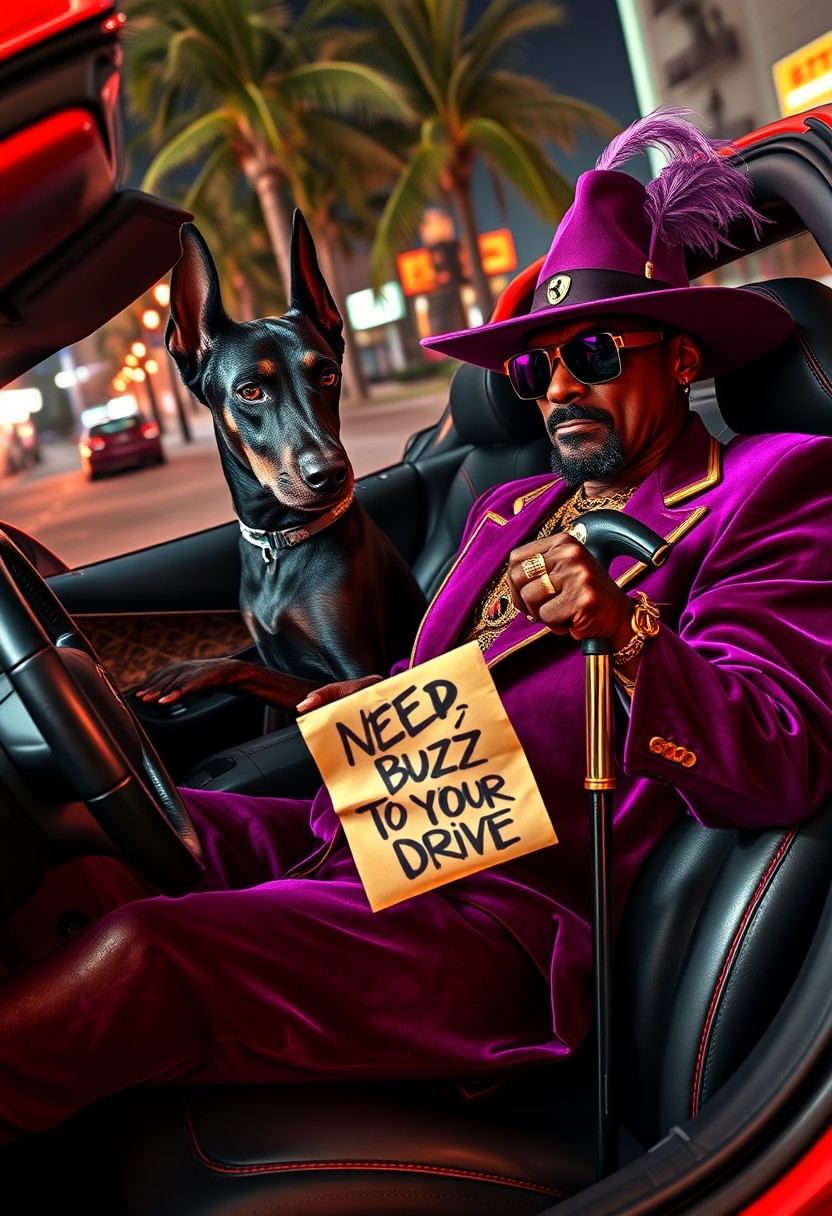A fierce black Doberman with cropped ears, eyes sharp and intimidating, commands the driver’s seat of a flashy 80s red Ferrari, gripping the wheel with a deadly focus. Beside him, Snoop Dogg, decked out in full pimp style, lounges with effortless swagger. He’s rocking a purple velvet suit with gold trim, a wide-brimmed hat adorned with a feather, oversized gold chains, and flashy rings on every finger. His cane rests across his lap, and he casually holds a crumpled letter with bold, graffiti-style text that reads: "NEED BUZZ TO DRIVE." The Ferrari’s interior is lined with slick, black leather and aggressive red stitching, radiating luxury. Outside, a neon-lit Miami backdrop with swaying palm trees and gritty streets contrasts the car's polished exterior. The entire scene oozes photorealistic detail, dripping with a mix of high-end style, street cool, and edgy attitude.