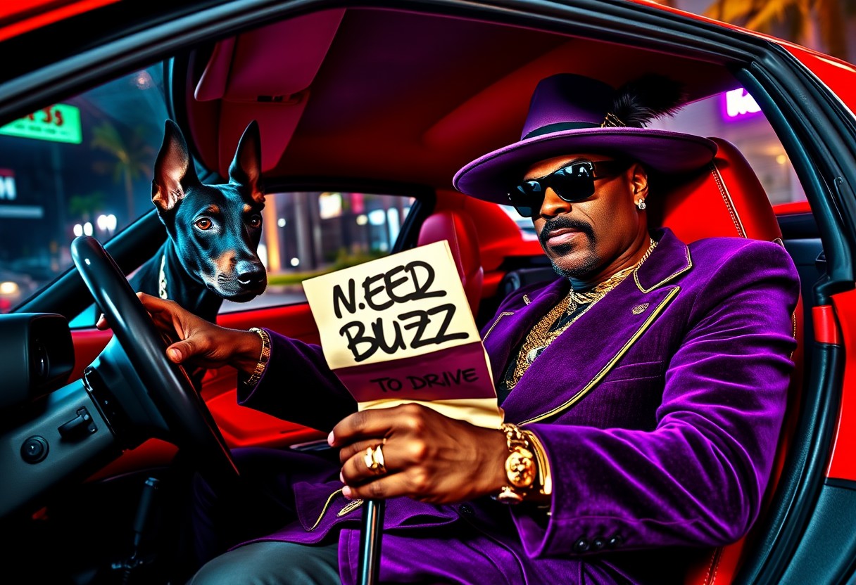 A fierce black Doberman with cropped ears, eyes sharp and intimidating, commands the driver’s seat of a flashy 80s red Ferrari, gripping the wheel with a deadly focus. Beside him, Snoop Dogg, decked out in full pimp style, lounges with effortless swagger. He’s rocking a purple velvet suit with gold trim, a wide-brimmed hat adorned with a feather, oversized gold chains, and flashy rings on every finger. His cane rests across his lap, and he casually holds a crumpled letter with bold, graffiti-style text that reads: "NEED BUZZ TO DRIVE." The Ferrari’s interior is lined with slick, black leather and aggressive red stitching, radiating luxury. Outside, a neon-lit Miami backdrop with swaying palm trees and gritty streets contrasts the car's polished exterior. The entire scene oozes photorealistic detail, dripping with a mix of high-end style, street cool, and edgy attitude.