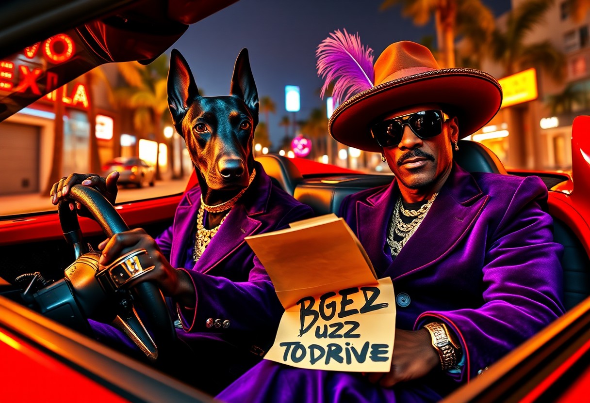 A fierce black Doberman with cropped ears, eyes sharp and intimidating, commands the driver’s seat of a flashy 80s red Ferrari, gripping the wheel with a deadly focus. Beside him, Snoop Dogg, decked out in full pimp style, lounges with effortless swagger. He’s rocking a purple velvet suit with gold trim, a wide-brimmed hat adorned with a feather, oversized gold chains, and flashy rings on every finger. His cane rests across his lap, and he casually holds a crumpled letter with bold, graffiti-style text that reads: "NEED BUZZ TO DRIVE." The Ferrari’s interior is lined with slick, black leather and aggressive red stitching, radiating luxury. Outside, a neon-lit Miami backdrop with swaying palm trees and gritty streets contrasts the car's polished exterior. The entire scene oozes photorealistic detail, dripping with a mix of high-end style, street cool, and edgy attitude.