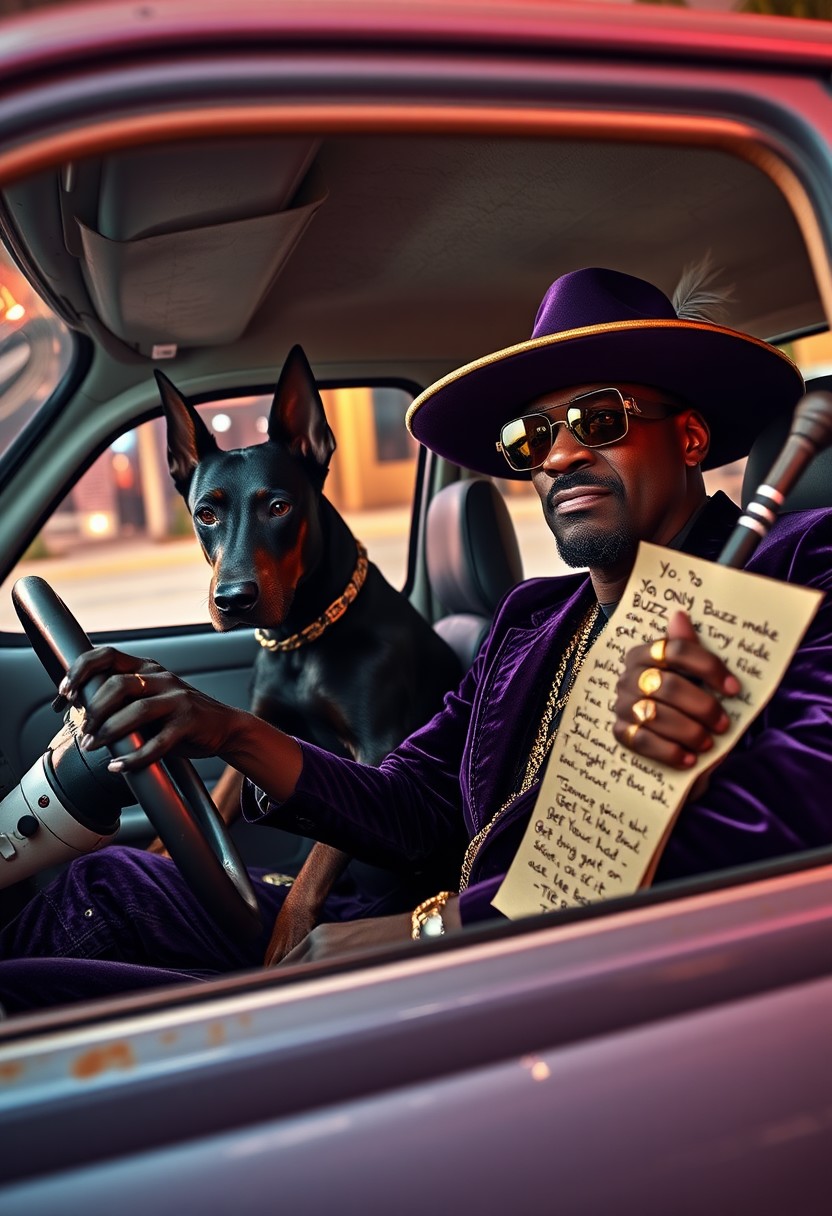 A fierce black Doberman with cropped ears, eyes sharp and intimidating, commands the driver’s seat of a tiny, vintage Fiat 500, gripping the steering wheel with the same deadly focus. Next to him, Snoop Dogg, in full pimp regalia, lounges with his effortless swagger, barely fitting in the cramped passenger seat. He’s decked out in a deep purple velvet suit with gold trim, a wide-brimmed hat with a feather, and dripping gold chains and rings, his cane propped awkwardly against the dashboard. In one hand, he holds a crumpled, slightly torn letter, its edges singed and stained. The letter reads in bold, messy handwriting: "YO, ONLY BUZZ CAN MAKE THIS TINY RIDE FLY. TIME’S RUNNING OUT—GET YOUR HEAD STRAIGHT OR LOSE IT. -THE BOSS." The Fiat’s interior is worn but stylish, with cracked leather seats and vintage details. Outside, a neon-lit Miami backdrop of palm trees and shadowy streets makes the little car look even more out of place, adding to the gritty, eccentric vibe. The scene is hyperrealistic, combining the cool, larger-than-life presence of Snoop with the quirky charm of the Fiat, in a highly detailed and textured setting full of rebellious energy.
