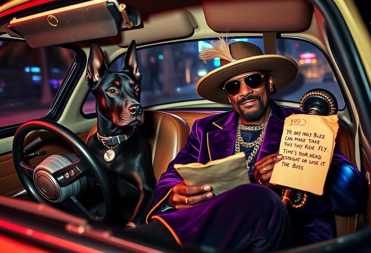 A fierce black Doberman with cropped ears, eyes sharp and intimidating, commands the driver’s seat of a tiny, vintage Fiat 500, gripping the steering wheel with the same deadly focus. Next to him, Snoop Dogg, in full pimp regalia, lounges with his effortless swagger, barely fitting in the cramped passenger seat. He’s decked out in a deep purple velvet suit with gold trim, a wide-brimmed hat with a feather, and dripping gold chains and rings, his cane propped awkwardly against the dashboard. In one hand, he holds a crumpled, slightly torn letter, its edges singed and stained. The letter reads in bold, messy handwriting: "YO, ONLY BUZZ CAN MAKE THIS TINY RIDE FLY. TIME’S RUNNING OUT—GET YOUR HEAD STRAIGHT OR LOSE IT. -THE BOSS." The Fiat’s interior is worn but stylish, with cracked leather seats and vintage details. Outside, a neon-lit Miami backdrop of palm trees and shadowy streets makes the little car look even more out of place, adding to the gritty, eccentric vibe. The scene is hyperrealistic, combining the cool, larger-than-life presence of Snoop with the quirky charm of the Fiat, in a highly detailed and textured setting full of rebellious energy.