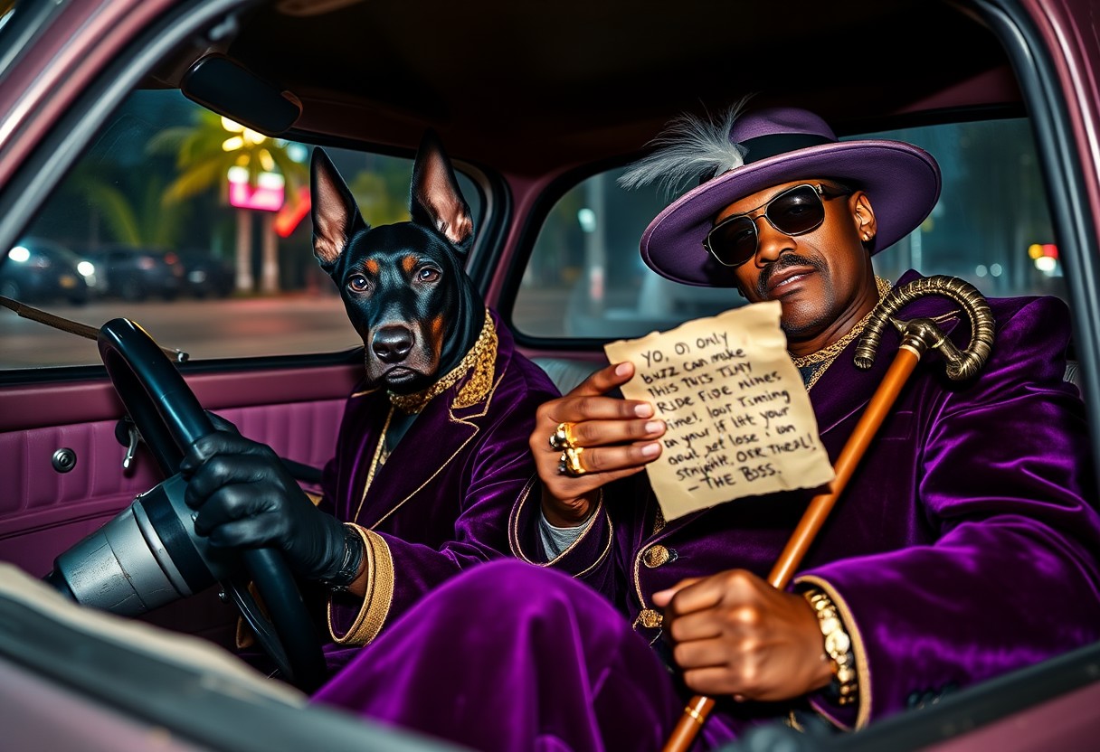 A fierce black Doberman with cropped ears, eyes sharp and intimidating, commands the driver’s seat of a tiny, vintage Fiat 500, gripping the steering wheel with the same deadly focus. Next to him, Snoop Dogg, in full pimp regalia, lounges with his effortless swagger, barely fitting in the cramped passenger seat. He’s decked out in a deep purple velvet suit with gold trim, a wide-brimmed hat with a feather, and dripping gold chains and rings, his cane propped awkwardly against the dashboard. In one hand, he holds a crumpled, slightly torn letter, its edges singed and stained. The letter reads in bold, messy handwriting: "YO, ONLY BUZZ CAN MAKE THIS TINY RIDE FLY. TIME’S RUNNING OUT—GET YOUR HEAD STRAIGHT OR LOSE IT. -THE BOSS." The Fiat’s interior is worn but stylish, with cracked leather seats and vintage details. Outside, a neon-lit Miami backdrop of palm trees and shadowy streets makes the little car look even more out of place, adding to the gritty, eccentric vibe. The scene is hyperrealistic, combining the cool, larger-than-life presence of Snoop with the quirky charm of the Fiat, in a highly detailed and textured setting full of rebellious energy.