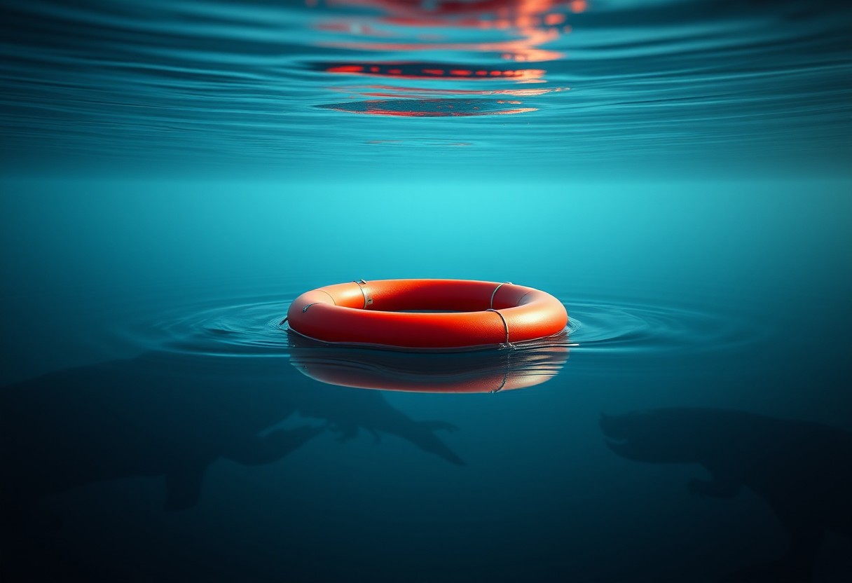 A striking composition featuring still, glassy water with a bright red rescue ring floating delicately on its surface. The waterline sits along the upper third of the frame, creating a sense of balance and calm. Below the water hidden sea monsters—can be faintly discerned, creating tension and mystery in the scene. The lighting is dramatic, casting soft highlights on the ring and subtle reflections on the water, while darker, moody shadows beneath hint at the lurking danger below. The image plays with contrast between safety and threat, with the tranquil surface concealing the unknown depths. A breathtaking, exquisitely detailed RAW HDR color photograph, capturing a masterpiece of realism with fine grain and crisp clarity. The image presents a stunning and captivating scene with brilliant lighting and a magnificent composition that adheres to the rule of thirds. Showcasing award-winning quality and incredibly realistic detail, the Rembrandt lighting adds depth and contrast, while the dynamic, film-style composition evokes the elegance of a world-famous painting. The final result is a lustrous, high-resolution image with rich detail and delicate, exquisite grain, making it ideal for wallpaper art or product shots. The centered composition emphasizes the subject, creating a strong, magnificent visual that serves as the perfect backdrop.