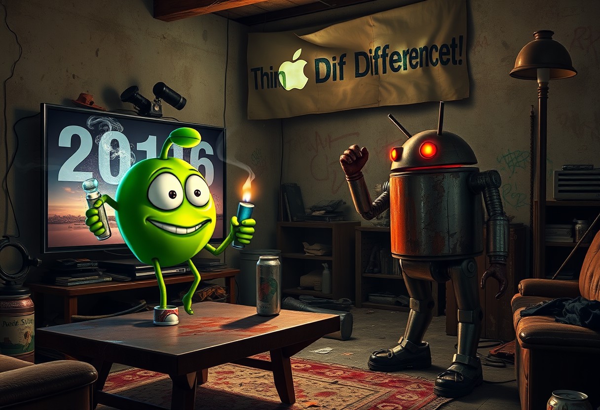 "In a grimy, dilapidated Florida crackhouse, a cartoonish green apple with exaggerated eyes and twisted limbs faces off against the iconic Android logo robot. The apple, perched on a stained coffee table, holds a meth glass pipe in one hand, with acrid smoke billowing from it. In its other hand, it clutches a lighter, flickering ominously. The massive OLED TV mounted on the wall casts a harsh, flickering light, creating unsettling shadows as it plays an unnervingly vivid Apple commercial. The room’s walls are grimy, covered in graffiti, and peeling wallpaper hangs in tatters. The floor is strewn with trash, broken furniture, and empty cans. The Android robot, with a rusted, dented exterior and malfunctioning eyes, stands in a defensive stance with twitching antennae. Above the TV, a warped cardboard sign with 'Think Different!' hangs crookedly, its jagged lettering backlit by flickering LEDs that cast eerie shadows on the peeling walls. The air is thick with mildew, decay, and the sharp scent of meth smoke. The green apple’s glossy skin and the Android’s grimy, rusted body are harshly illuminated by the flickering light, heightening the bizarre and unsettling confrontation in this derelict, drug-ridden setting."