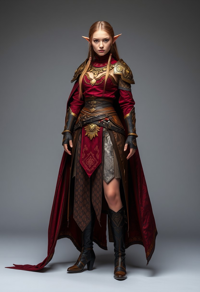 full shot, standing pose, female elf warrior, fashion costume, side opened skirt, extremely long cape, sexy leather armour, oriental fabrics, red and brown, golden ornaments, golden jewelry, golden embroidery, neutral grey background