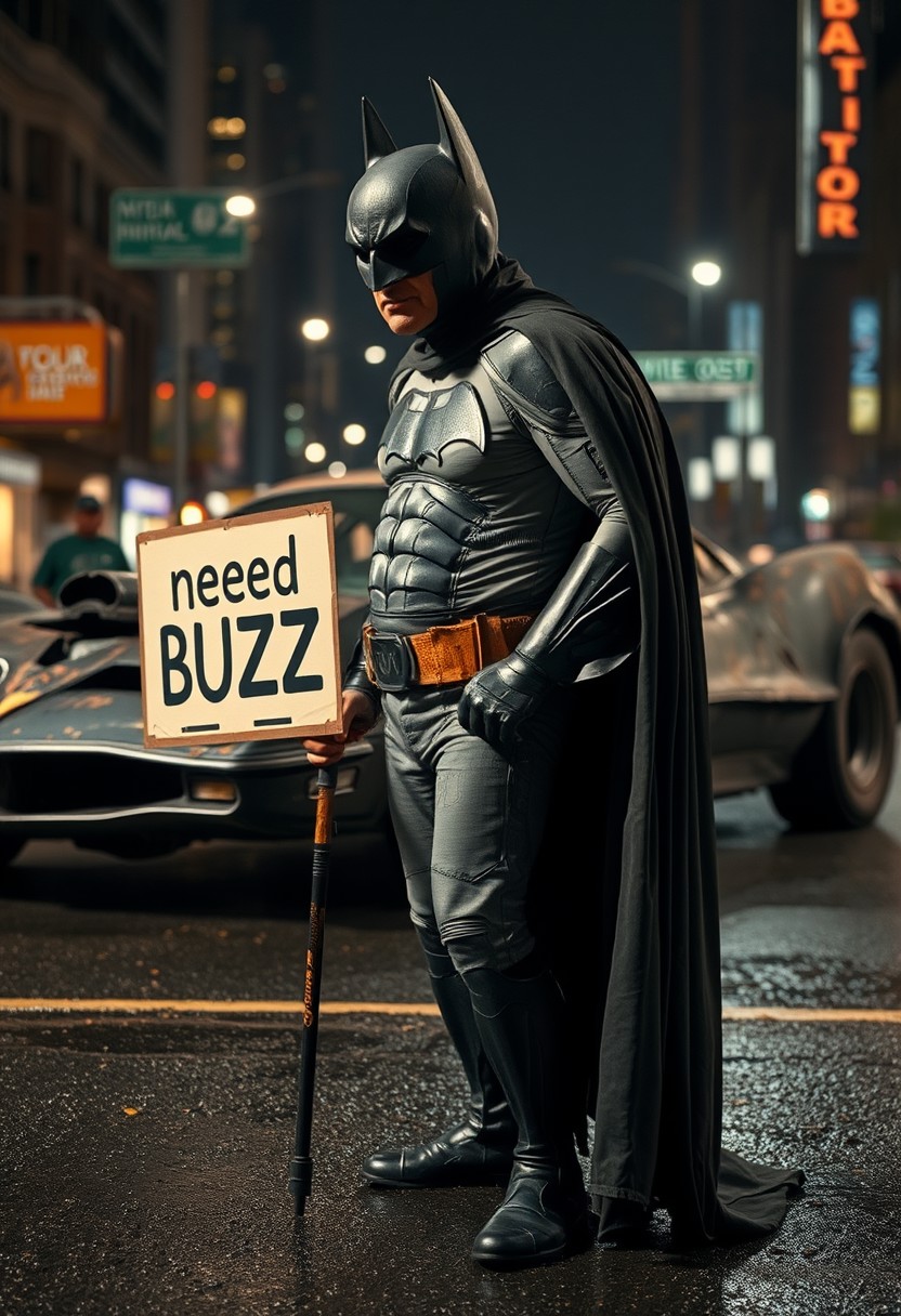 Closeup of old 77 year old Batman in worn out batman bodysuit and ripped worn cape standing using cane in front of his rusted and worn Batmobile holding sign "need BUZZ", night, wet asphalt, Gotham city in background
