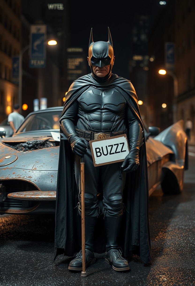 Closeup of old 77 year old Batman in worn out batman bodysuit and ripped worn cape standing using cane in front of his rusted and worn Batmobile holding sign "need BUZZ", night, wet asphalt, Gotham city in background