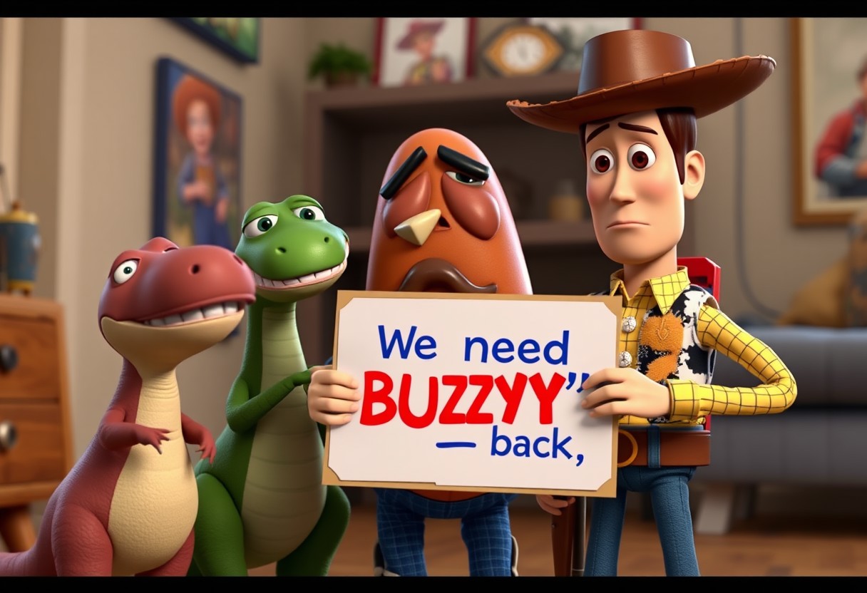 Toy Story characters Rex and Mr Potato head standing next to Crying and sad Woody holding sign with image of Buzz Lightyear and text ((("We need BUZZ back"))), blurry room background, pixar style