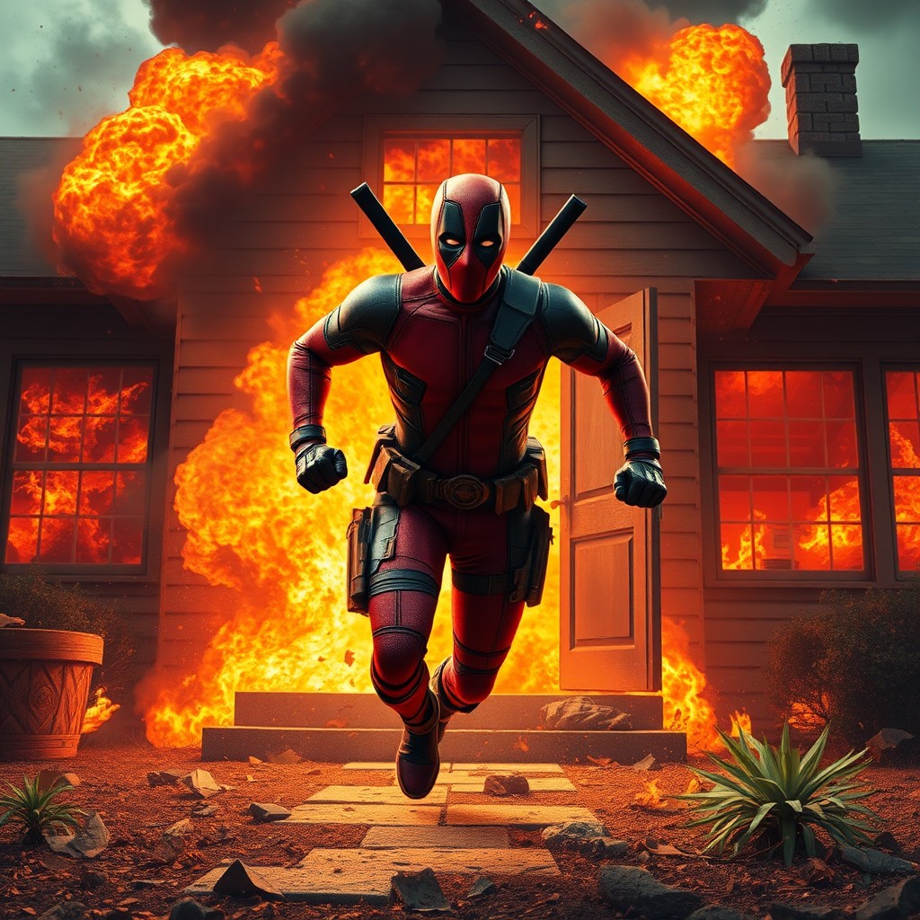 Deadpool is running out of a exploding house, super focus on male, deadpool is on fire, superrealistic