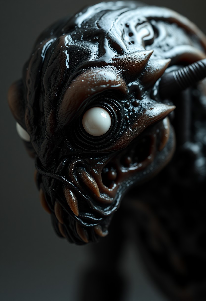 underworld hybrid creature, small white eyeballs, hyper realistic, ultra detailed, translucent oiled skin, black skin