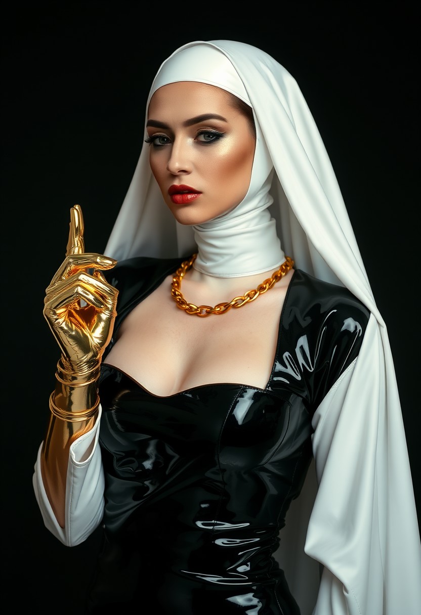 Avant-garde , chrome and gold , 27 year old swedish woman in latex nun outfit