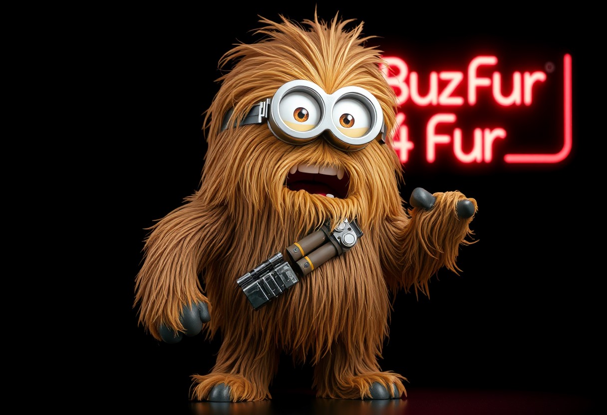 A minion from Despicable Me transformed into a Chewbacca-inspired creature, covered head to toe in thick, shaggy fur, blending the iconic features of a Wookie with the playful charm of a minion. Wearing a rugged ammo belt across its chest, the character strikes a powerful stance, mid-roar, exuding fierce energy. Its fur ripples with incredible texture, reflecting high detail and lifelike rendering. In the background, a sleek, sophisticated sign reads ‘Buzz 4 Fur’ in glowing neon letters, adding a quirky, futuristic touch to the scene. Set against a pitch-black backdrop, the image pops with cinematic, high-resolution 4K quality, creating a visual masterpiece that feels both whimsical and epic, with intense attention to detail in texture and expression