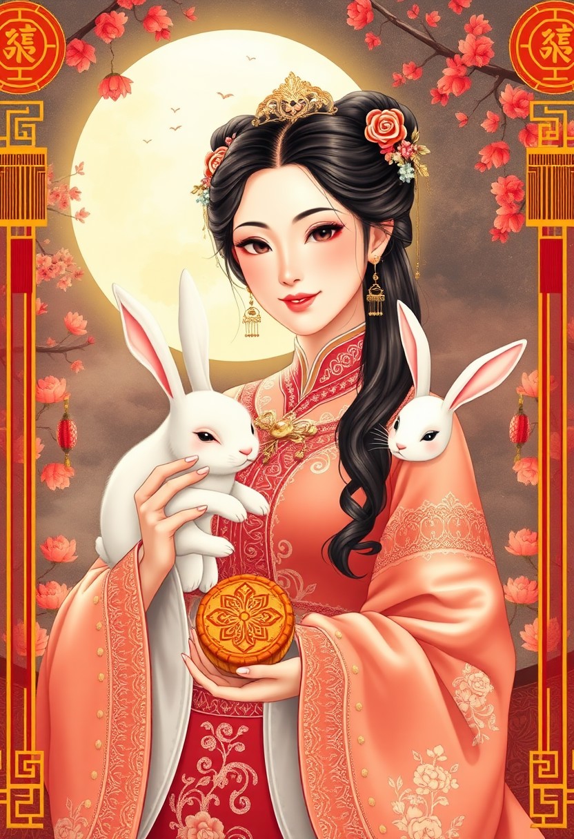 Chinese Mid-Autumn Festival, moon, mooncake, classical beauty holding a white rabbit