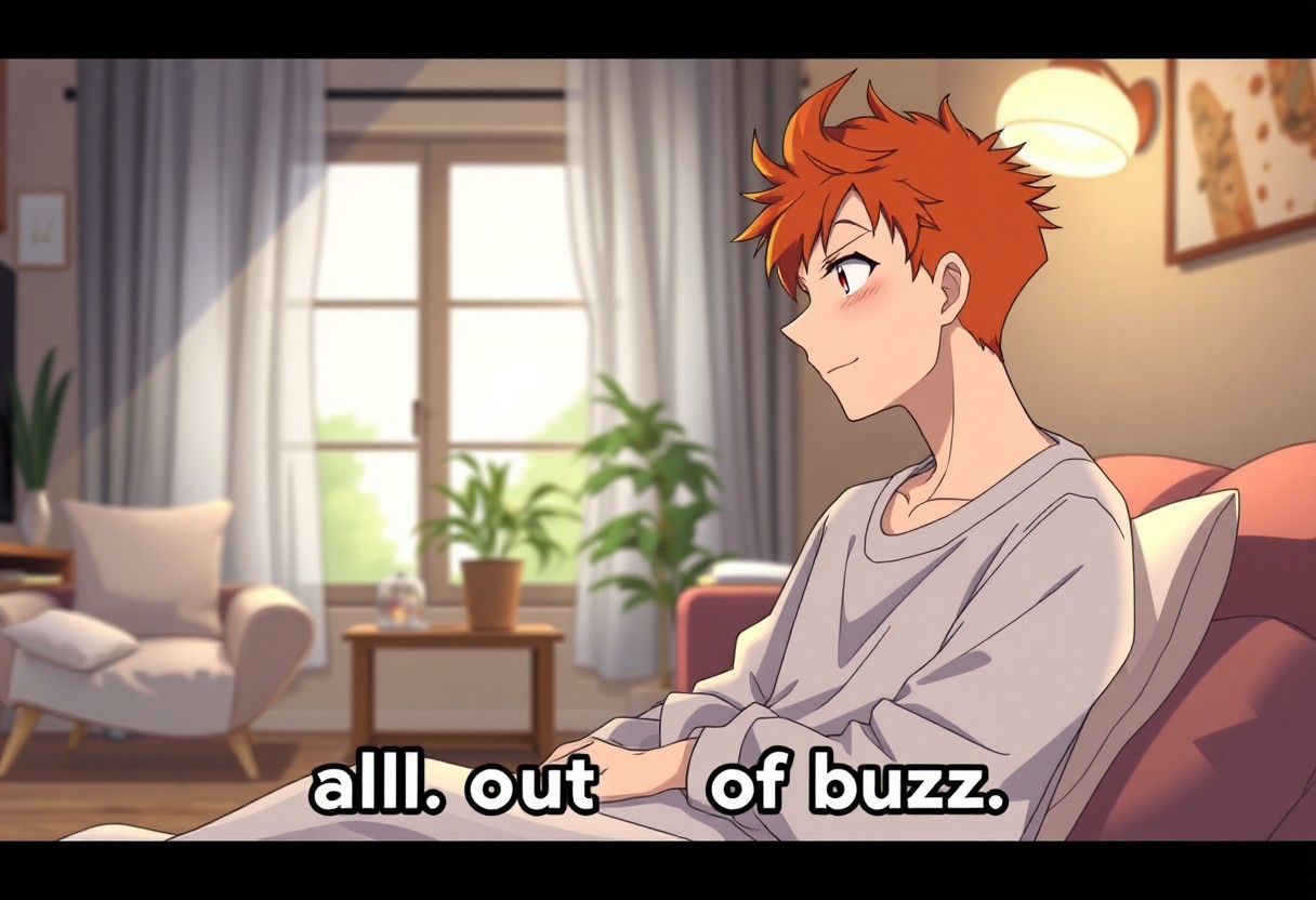 A ginger male, anime, text at bottom "all out of buzz", nightclothes on, in living room, neutral expression