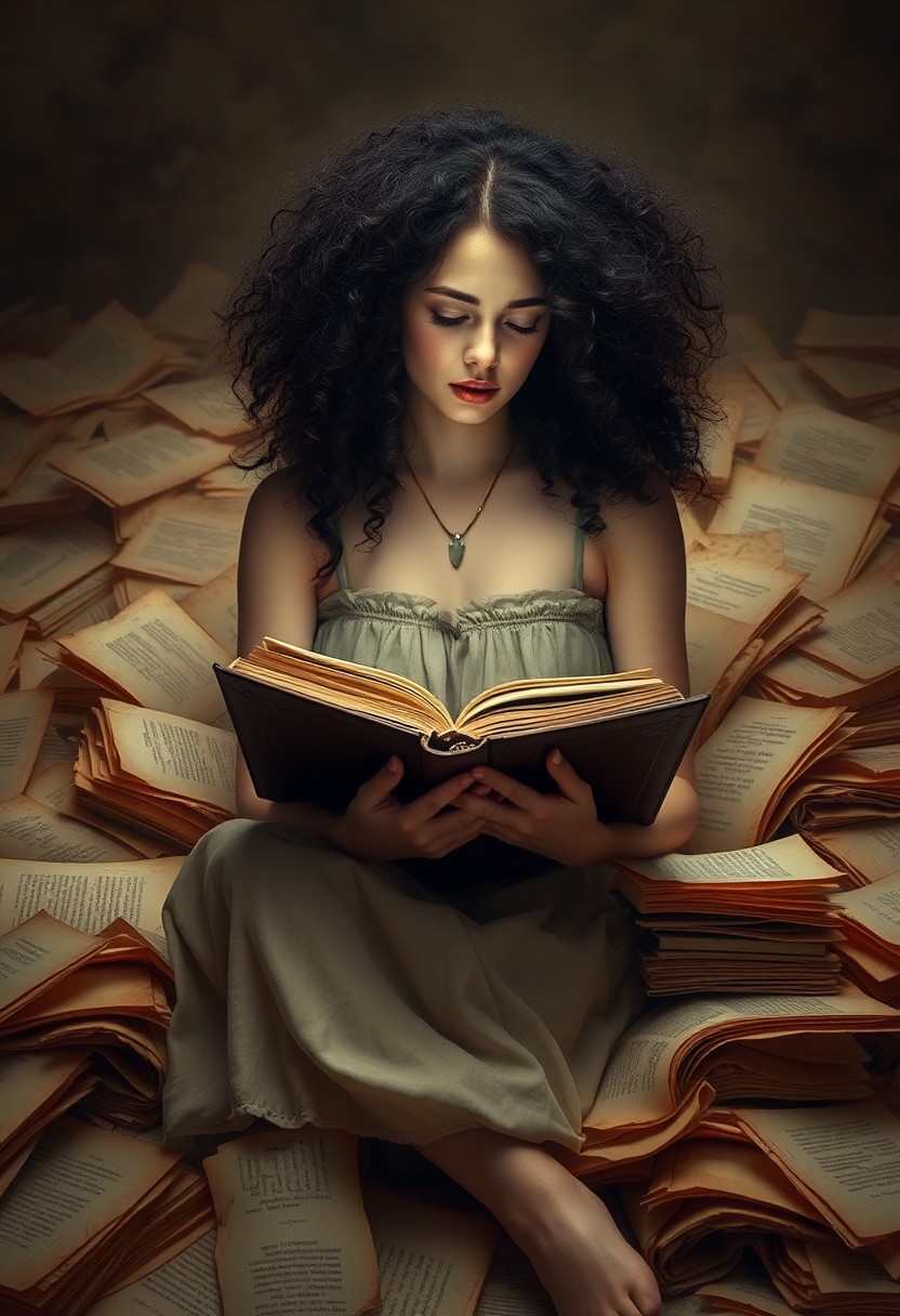mythp0rt,Midjourney_Whisper, A young woman with porcelain skin and voluminous, raven-hued curls sits serenely amidst a sea of antique parchment, engrossed in a leather-bound tome. Her pose, reminiscent of classical portraiture, is one of quiet contemplation, bathed in the lambent glow of an unseen celestial body. Capture the scene from a slightly elevated perspective, emphasizing the sheer volume of aged paper surrounding her, each sheet imbued with its own untold narrative. The color palette should evoke a sense of nostalgic melancholy, with muted ochres, sepia tones, and the ethereal luminescence of timeworn paper. Focus on conveying the tangible weight of history and knowledge enveloping her, hinting at the boundless worlds contained within both the written word and the depths of her own imagination.