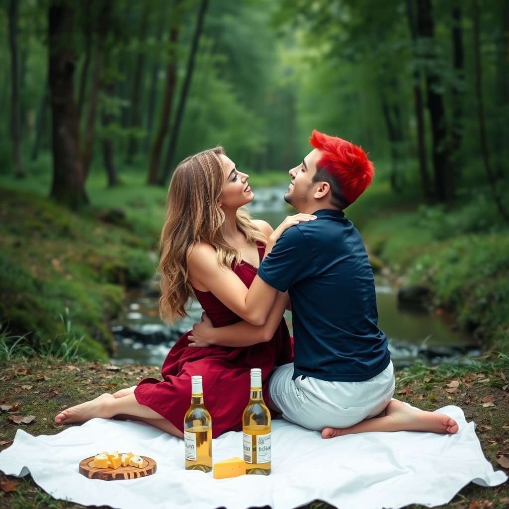 abstract dreamy art image in style of a couple sitting and embracing each other and starting into each other eyes. by a small stream in a green forest. girl has long wavy blond hair, wearing dark red cotton dress. the boy has very short hair dyed scarlet red, white shorts and a dark blue tshirt. they are both sitting on a white picnic sheet with a bottle of white wine and some cheese.