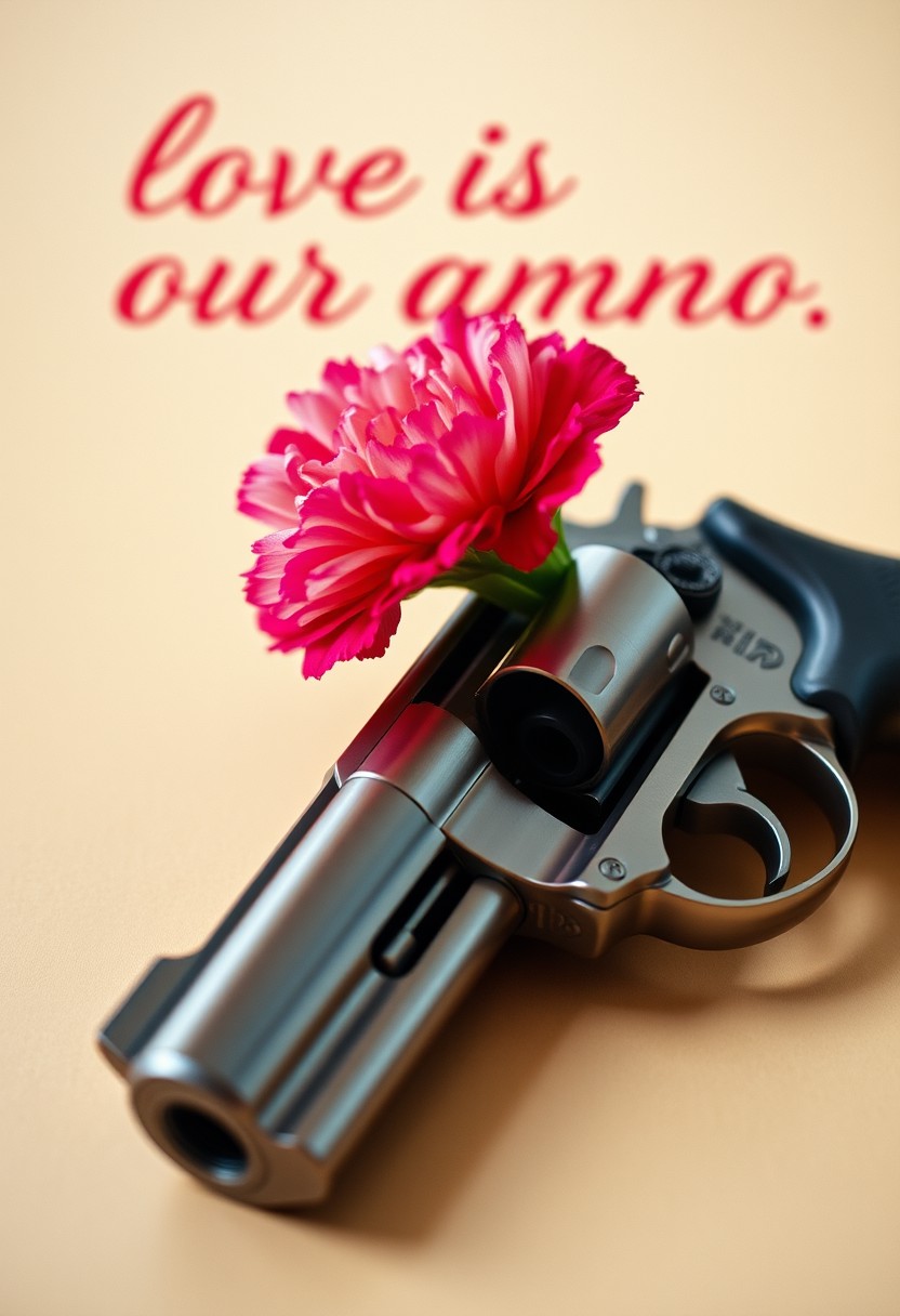 carnation, a revolver laid on the table with a single vividly colorful flower in its barrel, extreme close up, fashion photography, billboard, with a flowery text that reads "love is our ammo"
