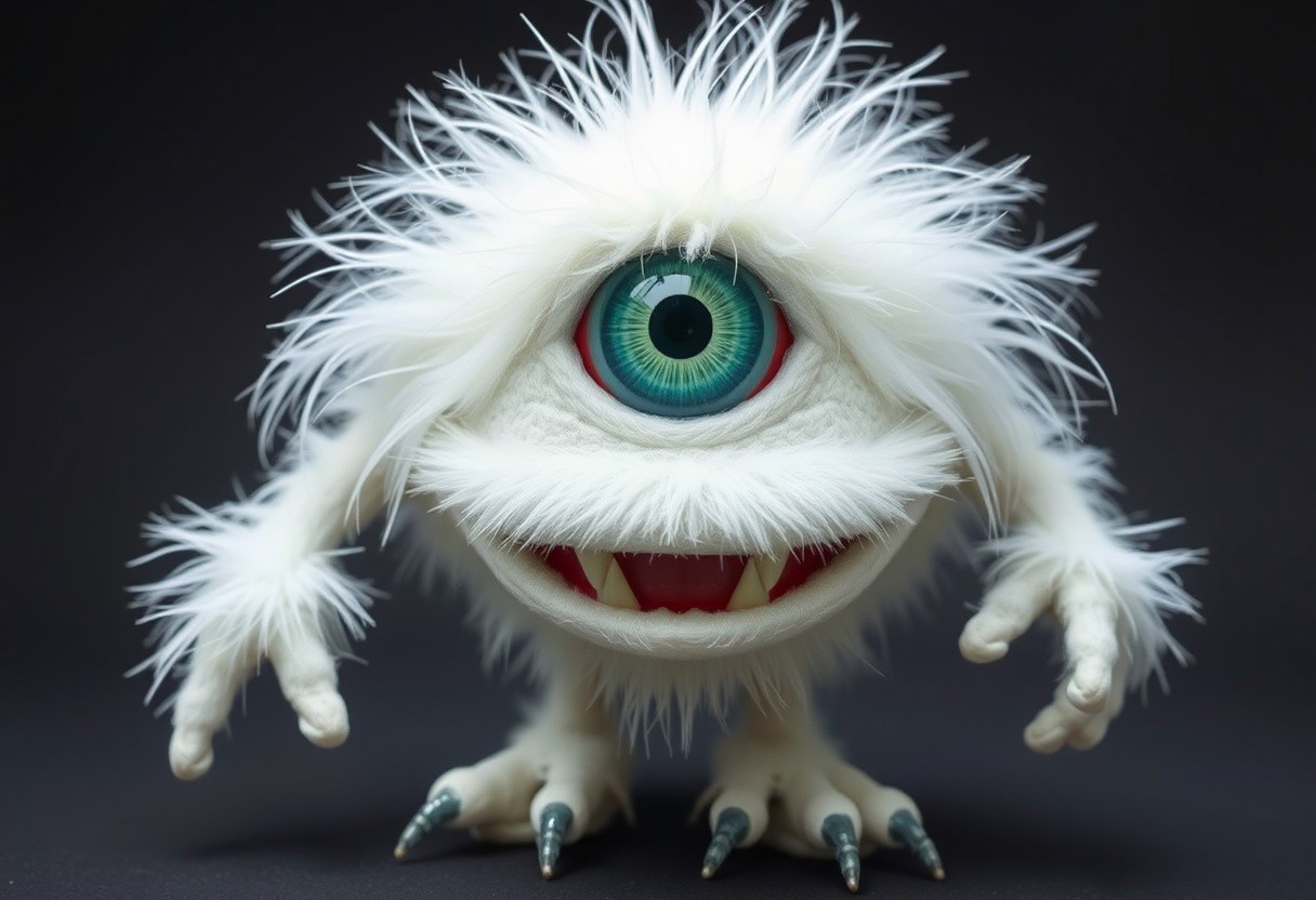 a white muppet with one central alien eye, and real sharp teeth, and three hoofed legs