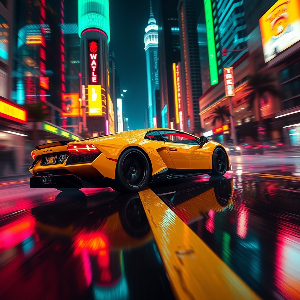 A cinematic close view shot of the lamborghini galardo speeding down a neon-lit street at night, reflecting the bright, colorful lights from surrounding skyscrapers, with rain-slicked roads creating a mirror effect of the car’s sleek yelow body. The glowing cyberpunk city skyline in the background enhances the futuristic vibe of this intense race scene.