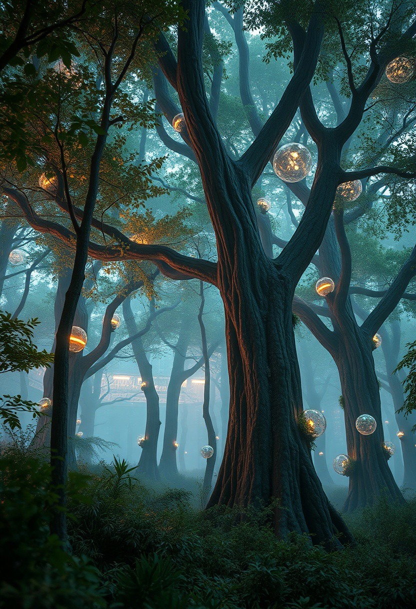A futuristic forest where trees are integrated with glowing technological elements, creating a harmonious fusion of nature and technology