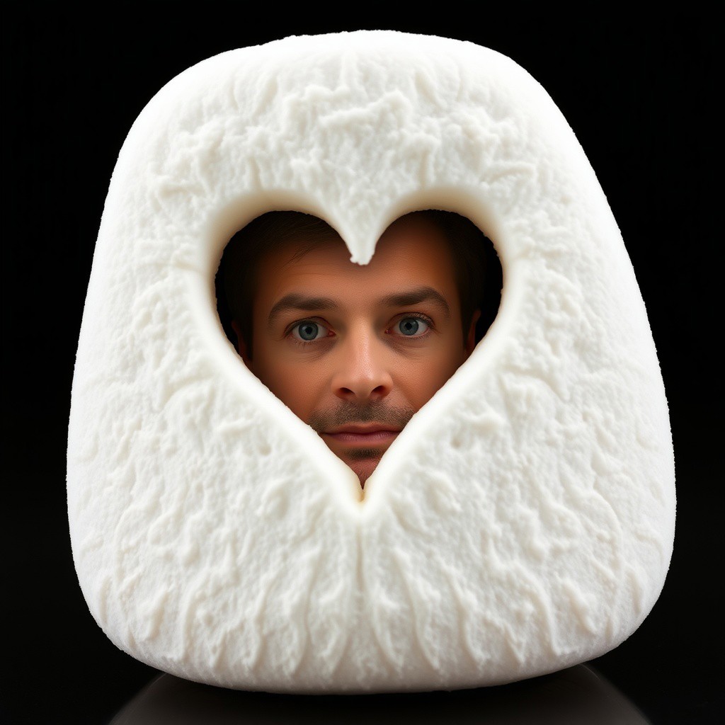 One marshmallow with a heart-shaped hole. A man is peeking out of the hole. The face is spread over the entire hole.