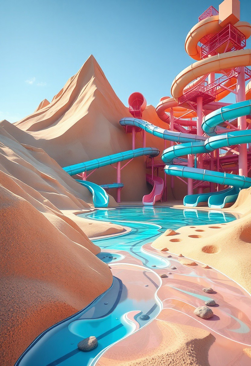sand dune in a waterpark, vibrant oil pastel colors, sharp geometric sand formations, exaggerated polygonal shapes of sand dunes, flowing yet angular water slides, interlocking polygonal structures, multichromatic reflections on water pools, recursive patterns in the sand, fragmented terrain beneath the waterpark, intricate fractal structures in the slides and supports, glowing reflections on water, saturated hues of blue, turquoise, and sandy beige, sculptural, brutalist waterpark design, sharp angular water currents, dystopian vibe, stark lighting from sun and water reflections, minimal organic details, photorealism, high resolution, (emphasis on sharp geometric sand and waterpark forms:1.6), intersecting planes of water, sand, and slides, fractured geometry, rigid yet flowing structures, unsettling atmosphere, (blurry:-1.2), (ugly:-1.3), (polished:-1.3), (cartoonish:-1.1), (low quality:-1.2), (smooth surfaces:-1.4), (overly ornate:-1.5), (disjointed anatomy:-1.3), (noisy:-1.1), (bad composition:-1.3)