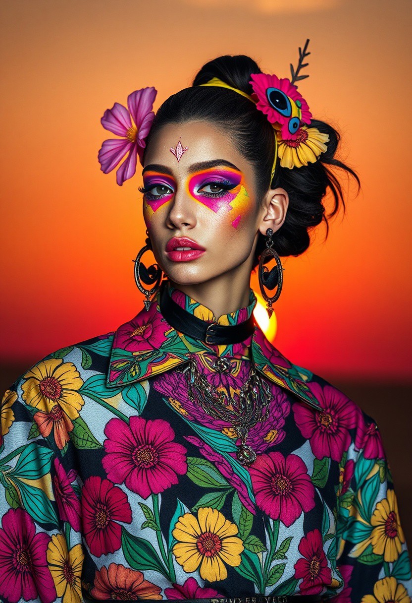 avant-garde fashion model, abstract floral patterns, bold geometric shapes, vibrant neon makeup, experimental fabrics, surreal colors, futuristic accessories, (high fashion:1.4), sunset background, artistic streetwear, exaggerated proportions, dramatic lighting, eclectic jewelry, (conceptual fashion:1.5), avant-garde hairstyle, unconventional textures, mixed media, artistic expression, (8k ultra-detailed), bold contrast, contemporary, futuristic, cutting edge