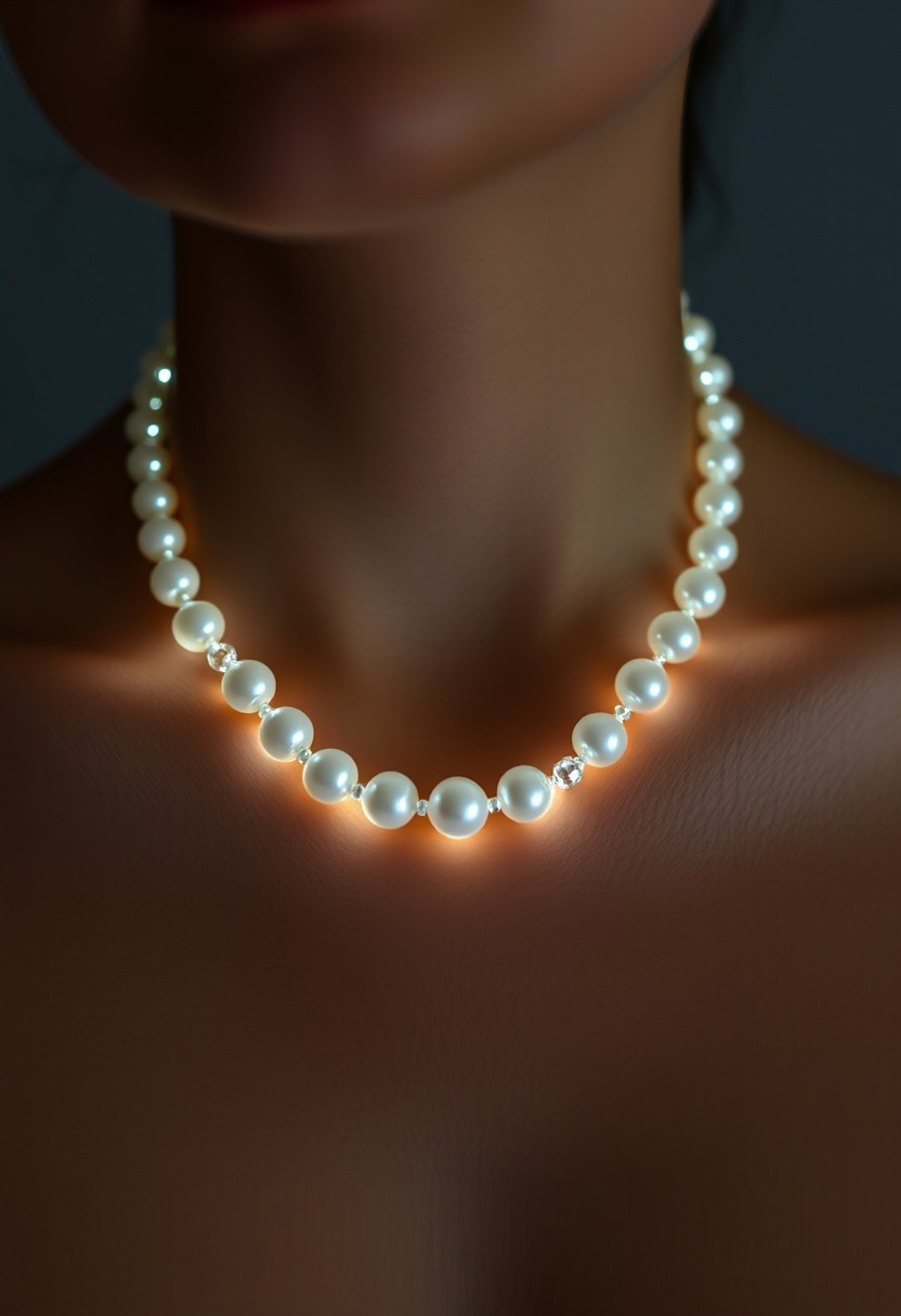 subdermal LED pearl necklace, (internal LED glow:1.7) forming a pearl-like pattern beneath the skin, (embedded LEDs:1.7) mimicking iconic pearl necklace design, soft glow radiating from beneath the collarbone, (pearl-like LED glow:1.6), (classic pearl jewelry design:1.5), natural skin tone with light diffusion, high-definition, (elegant pearls beneath the skin:1.5), ultra-realistic skin textures, (smooth radiant light transitions:1.5), refined and timeless, perfect for both formal and casual settings, (worn jewelry:-1.8), (visible necklace:-1.8), (clunky design:-1.5), seamless subdermal integration, high-resolution, glowing subdermal pearl accents, minimal external appearance, modern tech-enhanced beauty