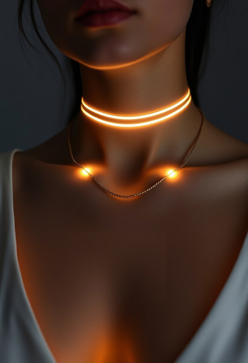 subdermal LED jewelry, (internal LED glow:1.7) forming sleek glowing segments beneath the skin, soft golden light radiating from beneath the collarbone, (smooth golden glow:1.6), (embedded LEDs:1.6) creating minimalistic glowing accents following the body's natural curves, (natural skin tone:1.5), high-definition, ultra-realistic skin textures, (seamless light integration:1.7), glowing light patterns under the skin without external components, (worn jewelry:-1.8), (visible necklace:-1.8), (chain segments:-1.8), radiant but sleek, smooth light transitions beneath the skin, tech-enhanced beauty, modern and minimalist