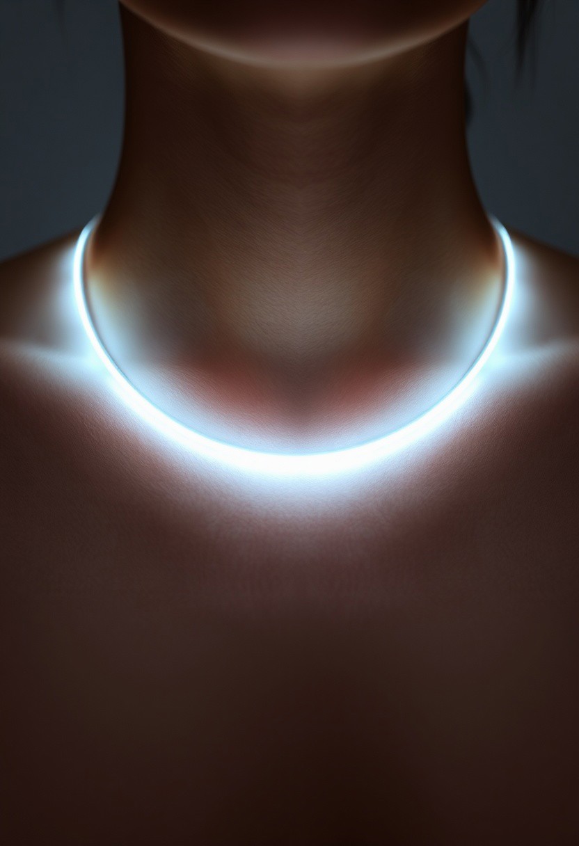 subdermal LED bar necklace, (internal LED glow:1.7), (embedded LEDs:1.8) forming a sleek, horizontal line of glowing light beneath the skin across the collarbone, soft light radiating outward from the center, (horizontal glowing line:1.6) following the natural curve of the body, smooth light diffusion, (natural skin tone:1.5), high-definition, (ultra-realistic skin texture:1.8), seamless light transitions beneath the skin, (no visible jewelry:1.8), (worn necklace:-1.8), (chains:-1.8), radiant horizontal light band under the skin, minimalist yet modern, perfect for casual and formal wear