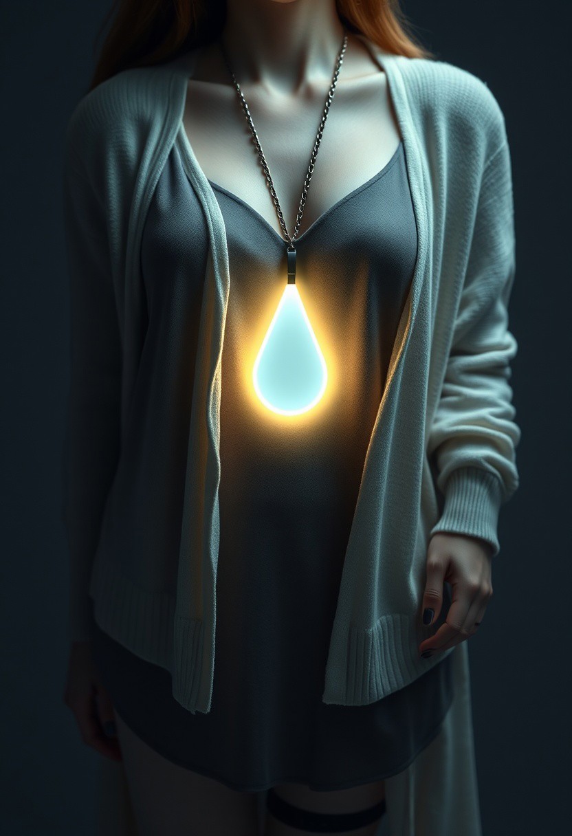 subdermal LED teardrop pendant, (internal LED glow:1.7), (embedded LEDs:1.8) forming a glowing teardrop shape beneath the skin, (soft, central light radiating outward:1.6), paired with (comfortable, stylish dress:1.4), (flat sandals:1.3), (light cardigan:1.3), (minimalist makeup with glowing skin:1.3), (natural hair flowing loosely:1.3), high-definition, (ultra-realistic textures:1.7), glowing teardrop light effect subtly integrated into the casual outfit, (worn jewelry:-1.8), (chains:-1.8), (external pendant:-1.8), (clunky design:-1.5), modern but subtle elegance, seamless and futuristic