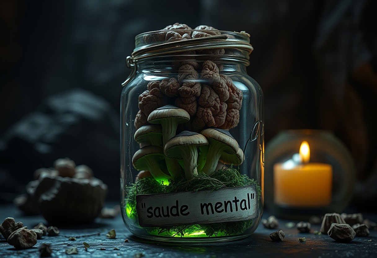 hyperdetailed ultra-detailed realistic, extremely detailed moldy brain with mushrooms in jar labeled saying ((("saude mental"))) with glowing mush green, detailed dark environment, dark shot, rtx, at exotic background , High Definition HD, High Detail, Perfect Composition, dark fantasy movie, cowboy shot,