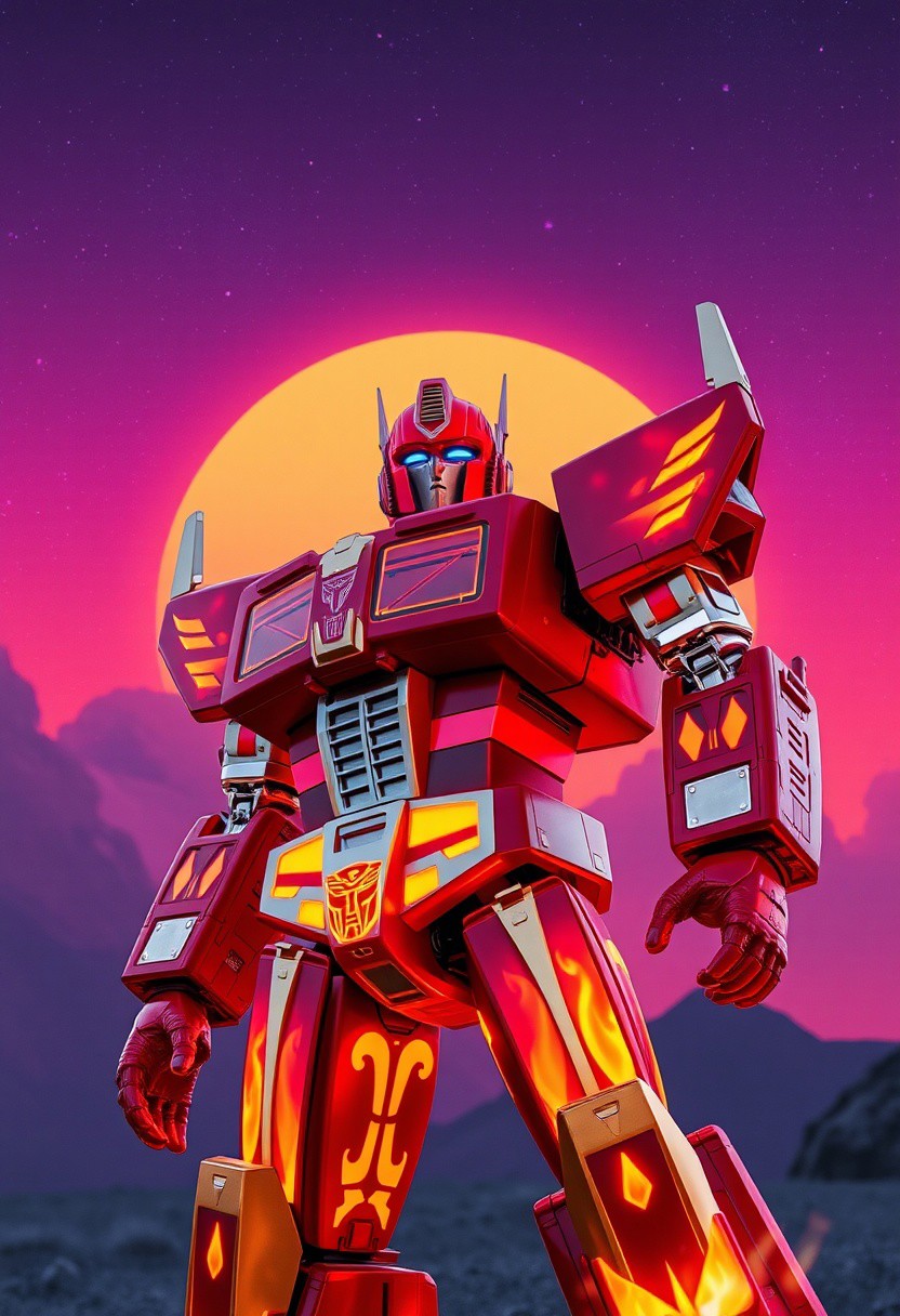 Red and gold transformer Rodimus robot, fire patterns, cowboy shot photograph, purple sky, cosmic stars, with an orange and blue synthwave sun background. Slightly turned. Decepticon.