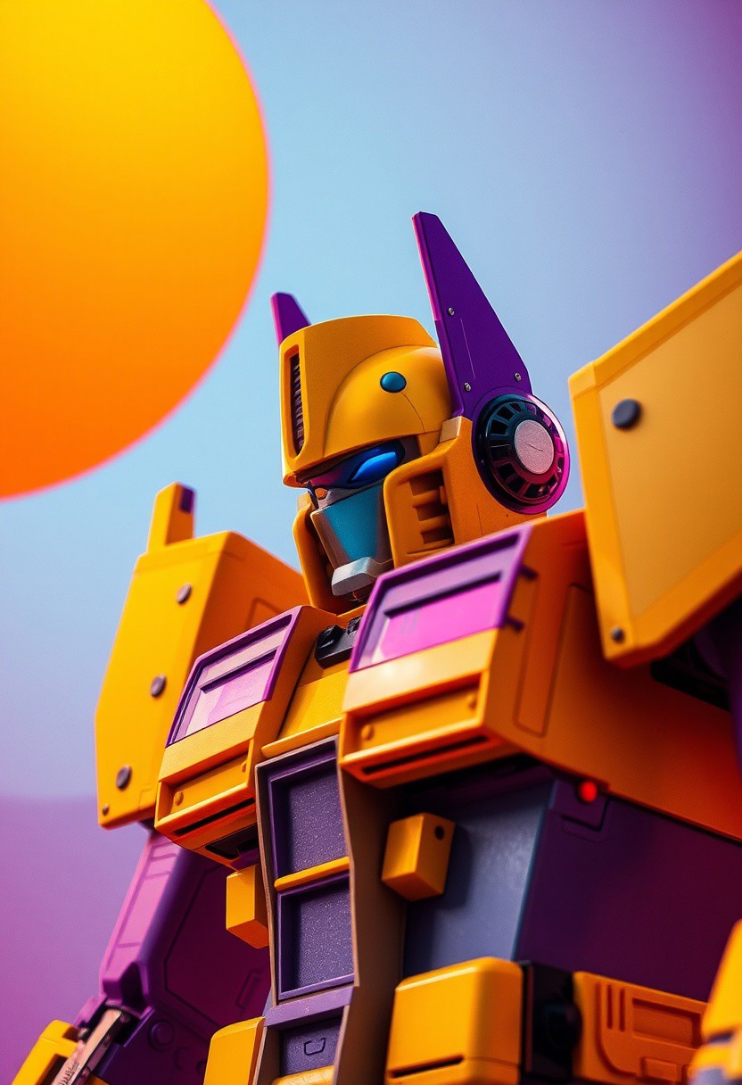 Yellow and purple transformer robot cowboy shot photograph with an orange and blue synthwave sun background. Slightly turned.