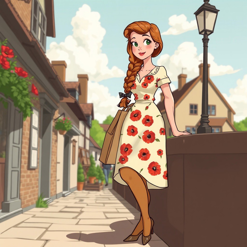The image is of a beautiful 18 year old woman. She is long ginger hair in a French braid and is wearing a cream dress with poppy print. It is a classic 1940s vintage cartoon. She is wearing tan stockings and high heels and is carrying a paper bag of shopping with her. She is leaning against a wall in a busy village setting. There is sunshine and clouds in the sky. She is petite, with a slim body and and a flat chest. She has pale skin with heavy freckles, a cute nose and green eyes. Her skin is sweating just a little as it is a hot day.