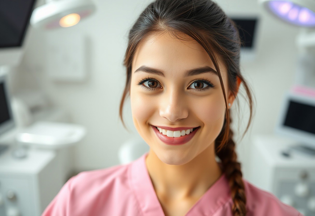 medium shot, symmetrical front view of a Beautiful real young woman, pink clinic uniform, dental work space at the background