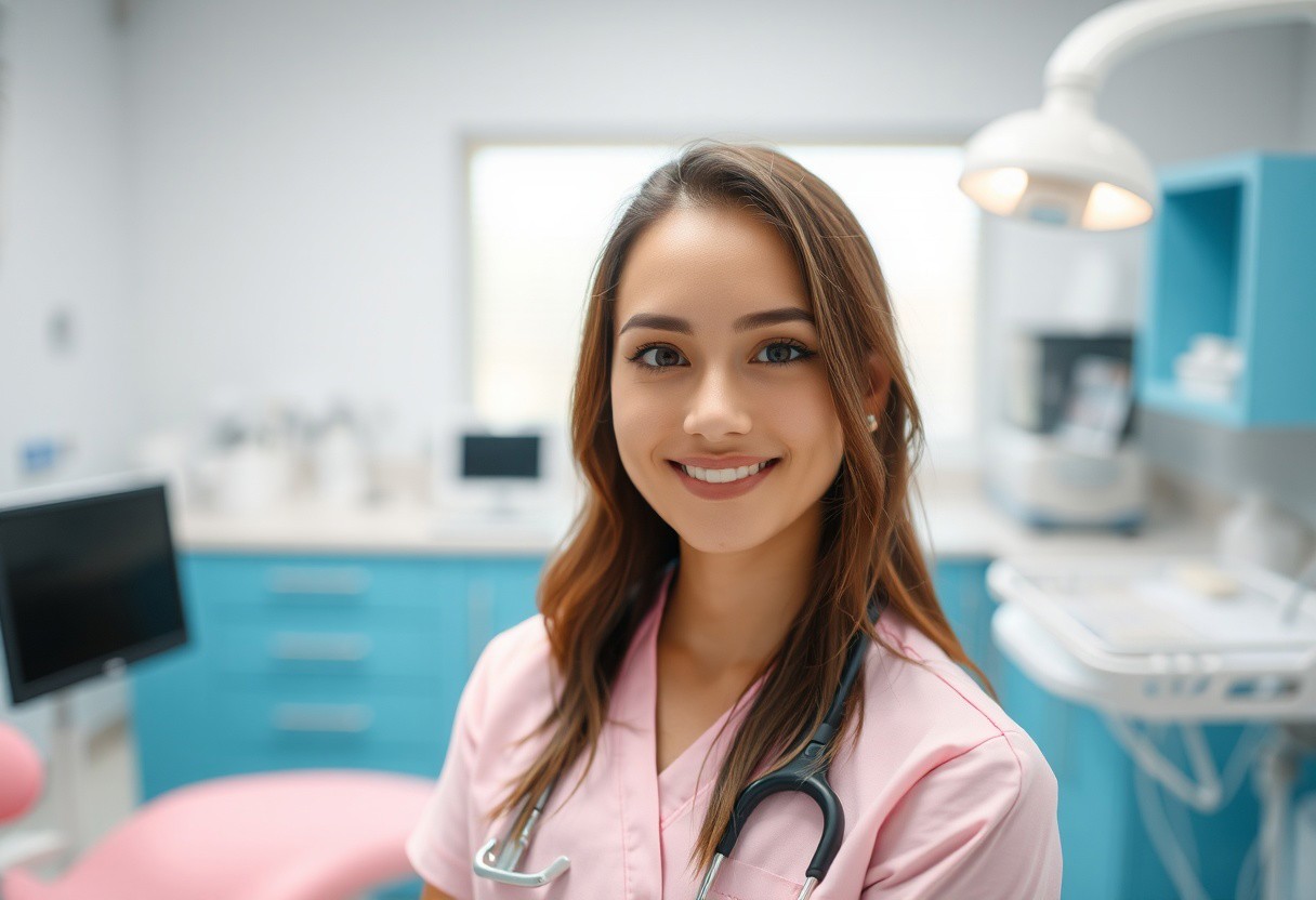 medium shot, front view of a Beautiful real young woman, pink clinic uniform, dental clinic work space at the background