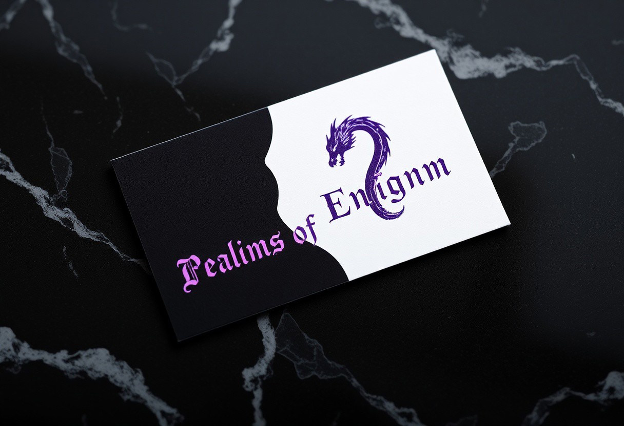 a business card with a question-mark shaped dragon reading "Realms of Enigma" in purple ink, sitting on a black marble background