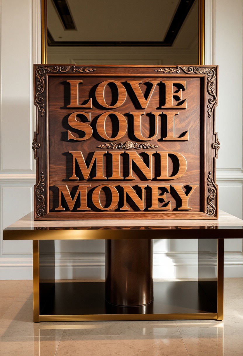 A striking, oversized wooden sign sits prominently on an elegant, polished table, radiating luxury and Italian flair. The sign is carved from rich, dark walnut with intricate, high-fashion details along the edges—sleek, modern swirls with Romanesque accents and gold-tinged geometric engravings. Stylized motifs like olive branches and grapevines add an exclusive touch, blending timeless elegance with cutting-edge style. The table itself is sleek and minimalist, made of glossy marble or polished wood, elevating the luxurious feel of the sign. The bold, hand-carved letters on the sign, arranged over four lines—‘LOVE,’ ‘SOUL,’ ‘MIND,’ and ‘MONEY’—are written in a chic, fashion-forward script that combines elegance with a sharp, modern edge. The letters are adorned with subtle gold accents, making them shimmer as the light catches them. Set against the table, the entire display exudes the essence of high-end Italian design, like a fashion statement piece in an exclusive boutique or upscale space, where artistry meets contemporary luxury. The combination of the finely crafted sign and the sleek table creates a perfect blend of sophistication and high-fashion allure.