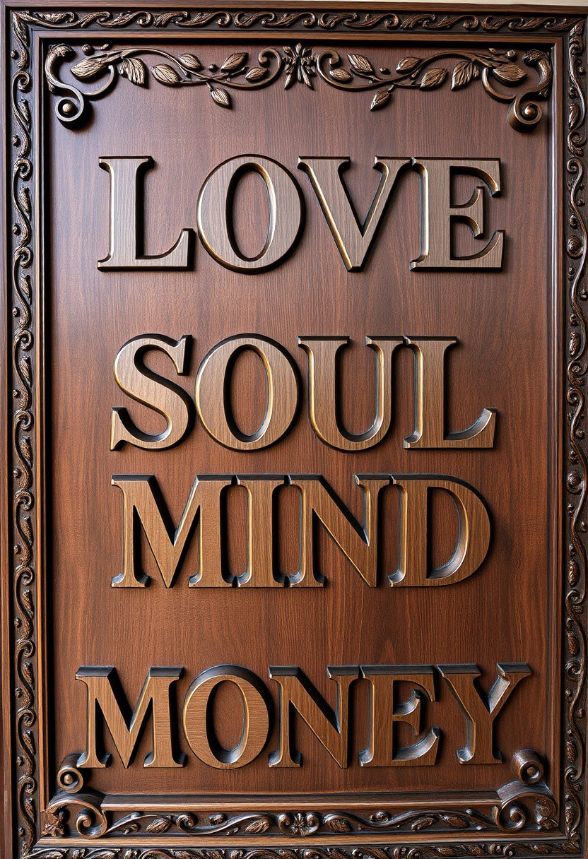 A striking, oversized wooden sign, expertly carved with luxurious, avant-garde Italian flair. The wood is a rich, polished dark walnut, reminiscent of high-end Tuscan craftsmanship, with intricate patterns along the edges—sleek, modernized swirls and bold Romanesque accents fused with cutting-edge design. Stylized engravings of olive branches, grapevines, and chic geometric motifs give it a high-fashion edge. The texture is a blend of perfectly aged wood, polished to perfection, with subtle cracks and hand-carved details that scream timeless luxury. Gold accents peek through the grain, adding an opulent touch to the overall design. Each letter is a statement—bold, hand-carved in a high-fashion script, sharp and elegant like something off a Milan runway. The four lines read: ‘LOVE,’ ‘SOUL,’ ‘MIND,’ and ‘MONEY.’ Each word carries a sense of exclusivity, with glamorous flourishes and stylish curves that blend Italian sophistication with cutting-edge modernity. The letters shimmer subtly, as if brushed with gold leaf, making the words pop with a bold, magnetic allure. This is more than a sign—it’s a fusion of ancient artistry and contemporary Italian fashion, perfect for a high-end boutique or an exclusive space where luxury meets timeless style.