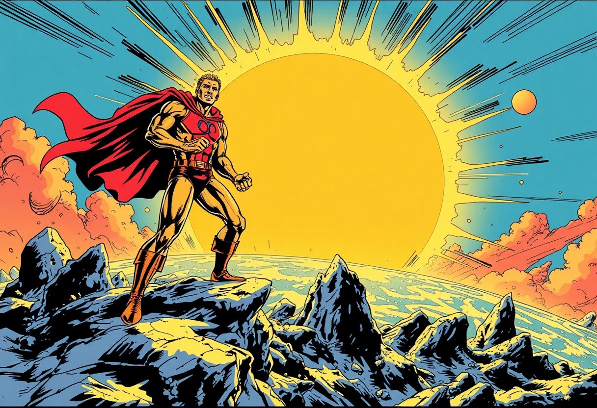 Comic book in the style of Jack Kirby, a 'super hero' stupidly brings the sun to the Earth's surface, chaos ensues,