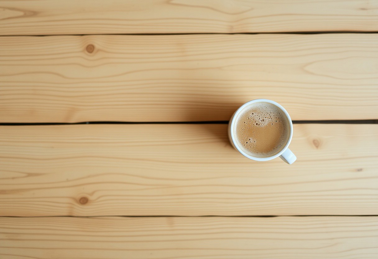 A view from the top of a wooden table with a coffee mug, classic stock photo, chill vibe, latte cafe on a classic wooden kitchen table. Empty table except the coffee mug. Coffee mug on the far right. Clean mug with fresh coffee, light foam on coffee. No space between plank, glued plank without gaps. Light coloured wood. Coffee mug should only take 1/16 of the image. View from far above. Large table, small mug. Mug on top right corner