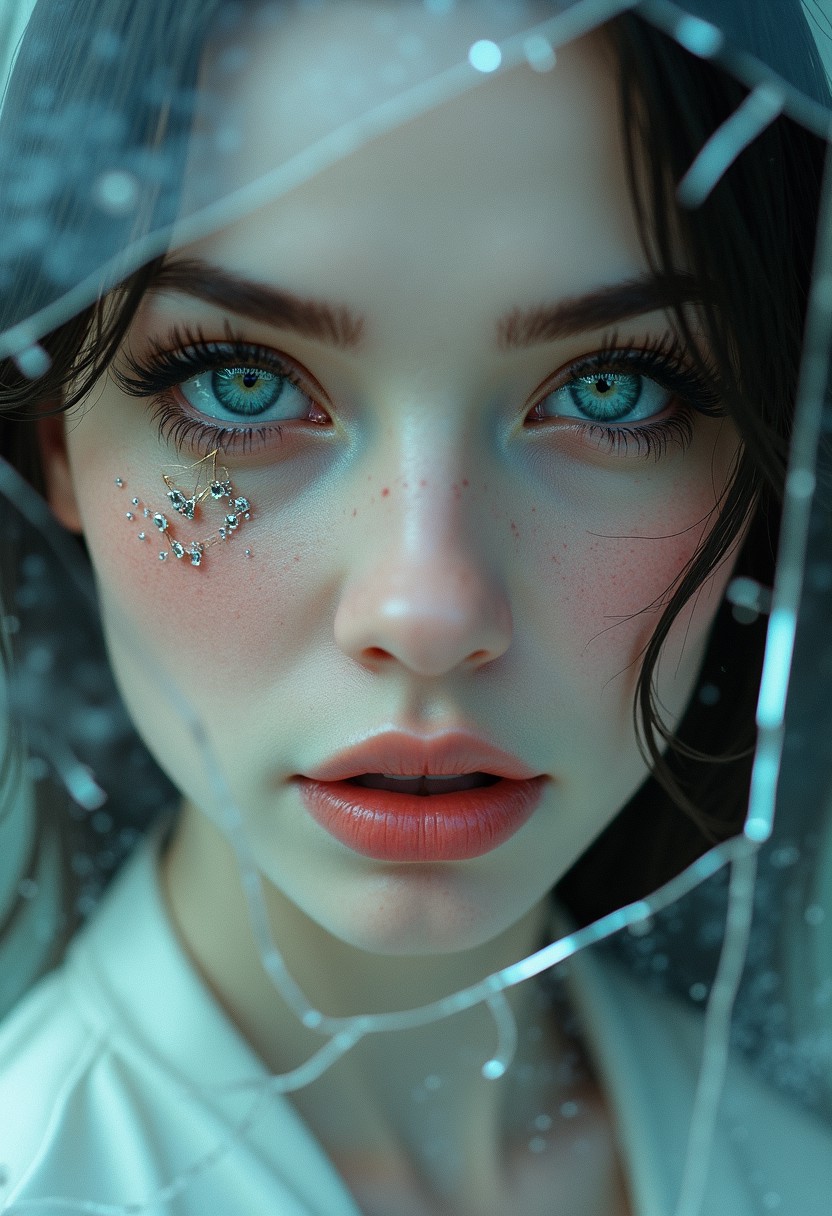 "fantasy goddess of mirrors", reflective, shatter, crash, broken glass, full portrait, finely drawn eyes, 8k resolution