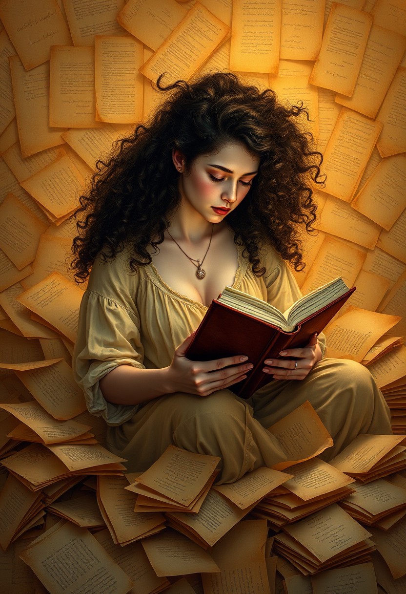mythp0rt,Midjourney_Whisper, A young woman with porcelain skin and voluminous, raven-hued curls sits serenely amidst a sea of antique parchment, engrossed in a leather-bound tome. Her pose, reminiscent of classical portraiture, is one of quiet contemplation, bathed in the lambent glow of an unseen celestial body. Capture the scene from a slightly elevated perspective, emphasizing the sheer volume of aged paper surrounding her, each sheet imbued with its own untold narrative. The color palette should evoke a sense of nostalgic melancholy, with muted ochres, sepia tones, and the ethereal luminescence of timeworn paper. Focus on conveying the tangible weight of history and knowledge enveloping her, hinting at the boundless worlds contained within both the written word and the depths of her own imagination.