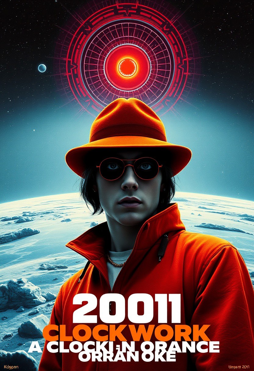“Design a movie poster that merges the dystopian, rebellious aesthetic of A Clockwork Orange with the futuristic, cosmic grandeur of 2001: A Space Odyssey. The poster should feature bold, contrasting imagery: Alex, the main character of A Clockwork Orange, wearing his signature bowler hat and eye makeup, standing against a backdrop of a cold, infinite space, with the HAL 9000 red eye glowing ominously in the distance. Incorporate elements of futuristic technology and Kubrick’s geometric, minimalist style from 2001, with an unsettling, surreal atmosphere that matches the themes of psychological control from A Clockwork Orange. Use a mix of warm oranges and deep blacks from Clockwork Orange and the clean whites and blues from 2001. Title placement should be bold and cinematic, fusing the typography styles of both films.”
